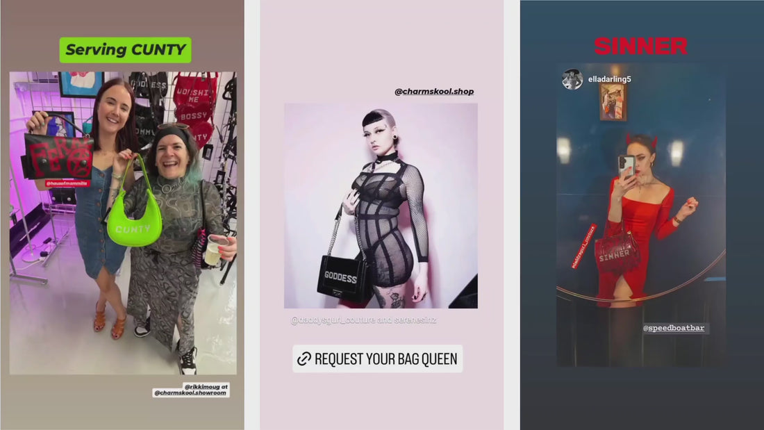 Unleash your divine power with a one-of-a-kind Daddy’s Gurl Resurrected Couture handbag—because basic bags are for basic bitches. Whether your fantasy is filthy, fierce, or fabulously over-the-top, we’ll transform it into a glittering rhinestone reality